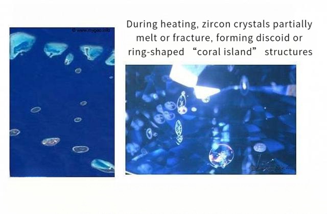 - At ~1800°C: Zircons may melt or burst, forming discoid or ring-shaped “coral island” structures—classic evidence of heat treatment.