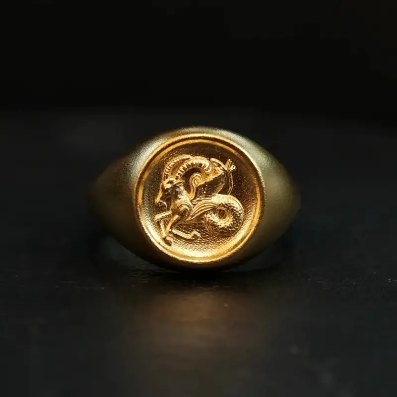 A handcrafted solid gold signet ring engraved with the Capricorn sea-goat, inspired by classical zodiac symbolism.